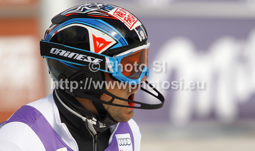 : Second placed Cristian Deville of Italy reacts in finish of second run of men slalom race of Audi FIS Alpine skiing World cup in Kranjska Gora, Slovenia. Men slalom race of Audi FIS Alpine skiing World cup was held in Kranjska Gora, Slovenia, on Sunday, 11th of March 2012.