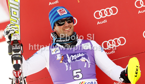 : Second placed Cristian Deville of Italy celebrates his medal won in men slalom race of Audi FIS Alpine skiing World cup in Kranjska Gora, Slovenia. Men slalom race of Audi FIS Alpine skiing World cup was held in Kranjska Gora, Slovenia, on Sunday, 11th of March 2012.