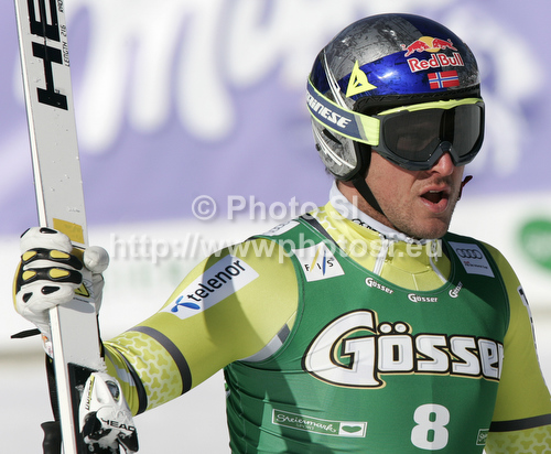 : Aksel Lund Svindal of Norway reacts in finish of men downhill race of Audi FIS Alpine skiing World cup finals in Schladming, Austria. Men downhill race of Audi FIS Alpine skiing World cup finals was held in Schladming, Austria, on Wednesday, 14th of March 2012.