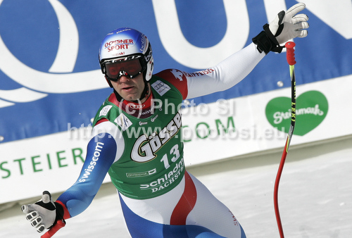 : Didier Defago of Switzerland reacts in finish of men downhill race of Audi FIS Alpine skiing World cup finals in Schladming, Austria. Men downhill race of Audi FIS Alpine skiing World cup finals was held in Schladming, Austria, on Wednesday, 14th of March 2012.