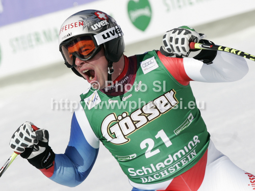 : Beat Feuz of Switzerland reacts in finish of men downhill race of Audi FIS Alpine skiing World cup finals in Schladming, Austria. Men downhill race of Audi FIS Alpine skiing World cup finals was held in Schladming, Austria, on Wednesday, 14th of March 2012.