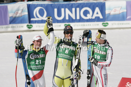 : Winner Aksel Lund Svindal of Norway (M), second placed Beat Feuz of Switzerland (L), thrirth placed Hannes Reichelt of Austria (R) celebrate their medals won in men downhill race of Audi FIS Alpine skiing World cup finals in Schladming, Austria. Men downhill race of Audi FIS Alpine skiing World cup finals was held in Schladming, Austria, on Wednesday, 14th of March 2012.