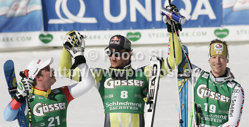 Schladming ,Austria - 14.03.2012 : Winner Aksel Lund Svindal of Norway (M), second placed Beat Feuz of Switzerland (L), thrirth placed Hannes Reichelt of Austria (R) celebrate their medals won in men downhill race of Audi FIS Alpine skiing World cup finals in Schladming, Austria. Men downhill race of Audi FIS Alpine skiing World cup finals was held in Schladming, Austria, on Wednesday, 14th of March 2012. Photo by: Tomaz Jeroncic
