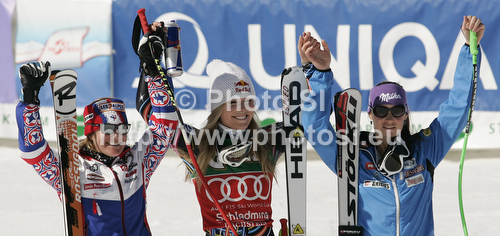 : Winner Lindsey Vonn of USA (M), ROLLAND Marion of France (L), Tina Maze of Slovenia (R) celebrates their medals won in women downhill race of Audi FIS Alpine skiing World cup finals in Schladming, Austria. Women downhill race of Audi FIS Alpine skiing World cup finals was held in Schladming, Austria, on Wednesday, 14th of March 2012.