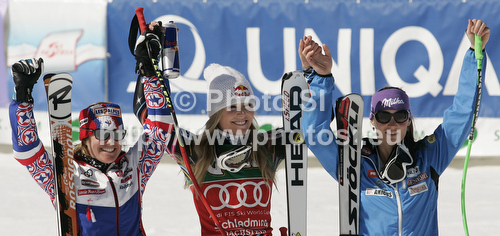 Schladming ,Austria - 14.03.2012 : Winner Lindsey Vonn of USA (M), ROLLAND Marion of France (L), Tina Maze of Slovenia (R) celebrates their medals won in women downhill race of Audi FIS Alpine skiing World cup finals in Schladming, Austria. Women downhill race of Audi FIS Alpine skiing World cup finals was held in Schladming, Austria, on Wednesday, 14th of March 2012. Photo by: Tomaz Jeroncic