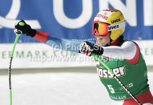 : Nadja Kamer of Switzerland reacts in finish of women downhill race of Audi FIS Alpine skiing World cup finals in Schladming, Austria. Women downhill race of Audi FIS Alpine skiing World cup finals was held in Schladming, Austria, on Wednesday, 14th of March 2012.