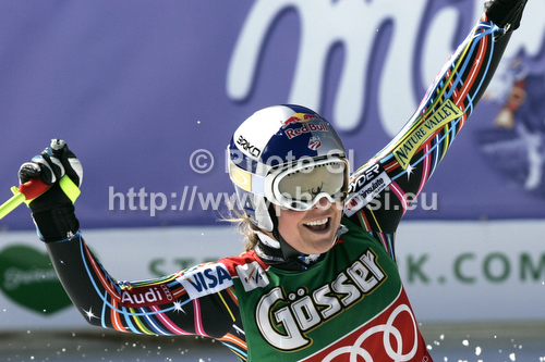 : reacts in finish of women downhill race of Audi FIS Alpine skiing World cup finals in Schladming, Austria. Women downhill race of Audi FIS Alpine skiing World cup finals was held in Schladming, Austria, on Wednesday, 14th of March 2012.