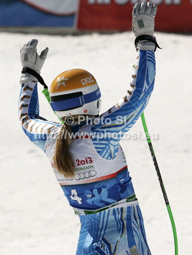 : Anja Paerson of Sweden reacts in finish of women Super-G race of Audi FIS Alpine skiing World cup finals in Schladming, Austria. Women Super-G race of Audi FIS Alpine skiing World cup finals was held in Schladming, Austria, on Thursday, 15th of March 2012.