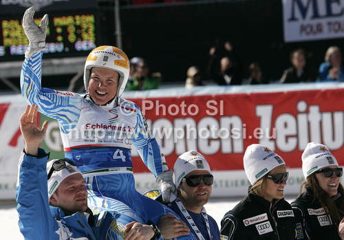 : Anja Paerson of Sweden celebrates her last run in career in finish of women Super-G race of Audi FIS Alpine skiing World cup finals in Schladming, Austria. Women Super-G race of Audi FIS Alpine skiing World cup finals was held in Schladming, Austria, on Thursday, 15th of March 2012.