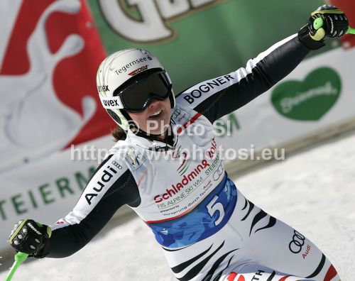 : Viktoria Rebensburg of Germany reacts in finish of women Super-G race of Audi FIS Alpine skiing World cup finals in Schladming, Austria. Women Super-G race of Audi FIS Alpine skiing World cup finals was held in Schladming, Austria, on Thursday, 15th of March 2012.