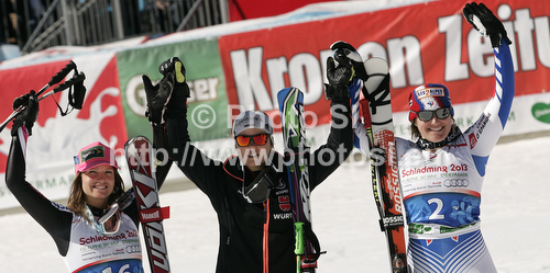 : Winner Viktoria Rebensburg of Germany (M), second placed Julia Mancuso of USA (L), Thirdh placed Marion Rolland of France (R) celebrates their medals won in women Super-G race of Audi FIS Alpine skiing World cup finals in Schladming, Austria. Women Super-G race of Audi FIS Alpine skiing World cup finals was held in Schladming, Austria, on Thursday, 15th of March 2012.