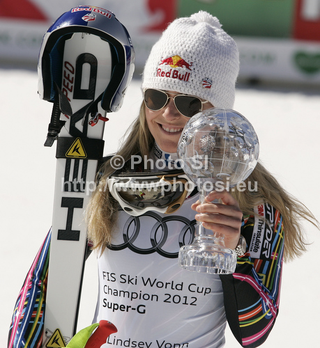 : Lindsey Vonn of USA celebrates her overall victory in women Super-G Audi FIS Alpine skiing World cup finals in Schladming, Austria. Last women Super-G race of Audi FIS Alpine skiing World cup finals was held in Schladming, Austria, on Thursday, 15th of March 2012.