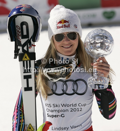 : Lindsey Vonn of USA celebrates her overall victory in women Super-G Audi FIS Alpine skiing World cup finals in Schladming, Austria. Last women Super-G race of Audi FIS Alpine skiing World cup finals was held in Schladming, Austria, on Thursday, 15th of March 2012.
