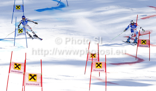 : Felix Neureuther of Germany (L) and Silvan Zurbriggen of Switzerland (R) skiing in team event race of Audi FIS Alpine skiing World cup finals in Schladming, Austria. Team event race of Audi FIS Alpine skiing World cup finals was held in Schladming, Austria, on Friday, 16th of March 2012.