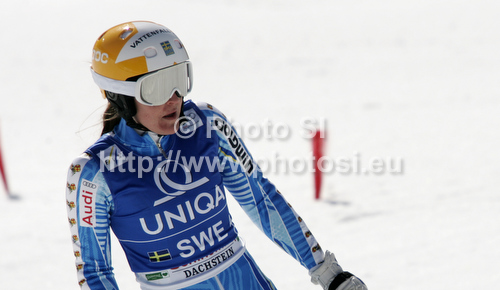 : Therese Borssen of Sweden in finish of team event race of Audi FIS Alpine skiing World cup finals in Schladming, Austria. Team event race of Audi FIS Alpine skiing World cup finals was held in Schladming, Austria, on Friday, 16th of March 2012.