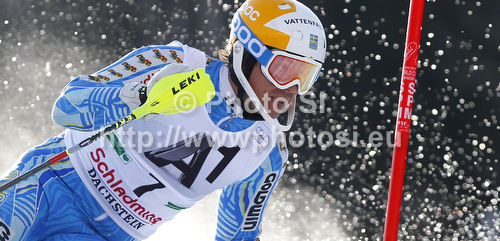 : Andre Myhrer of Sweden skiing in first run of men slalom race of Audi FIS Alpine skiing World cup finals in Schladming, Austria. Men slalom race of Audi FIS Alpine skiing World cup finals was held in Schladming, Austria, on Sunday, 18th of March 2012.