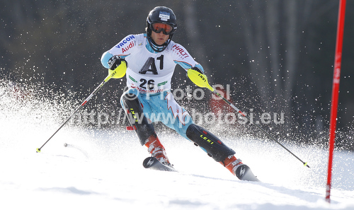 : Santeri Paloniemi of Finland skiing in first run of men slalom race of Audi FIS Alpine skiing World cup finals in Schladming, Austria. Men slalom race of Audi FIS Alpine skiing World cup finals was held in Schladming, Austria, on Sunday, 18th of March 2012.