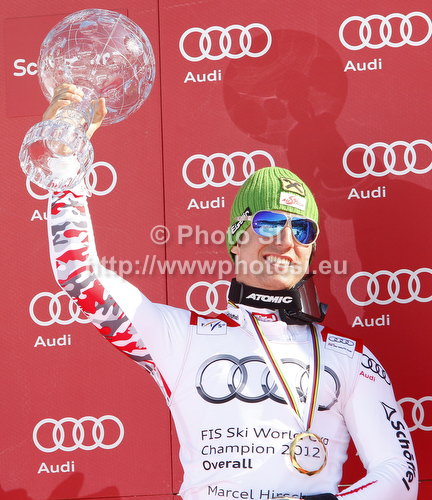 Schladming ,Austria - 18.03.2012 : Overall FIS alpine skiing World cup winner Marcel Hirscher of Austria celebrates his trophy after last race of Audi FIS Alpine skiing World cup finals in Schladming, Austria. Last men race of Audi FIS Alpine skiing World cup finals was held in Schladming, Austria, on Sunday, 18th of March 2012. Photo by: Tomaz Jeroncic