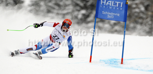 : Patrick Kueng of Switzerland skiing in men Super-g race of FIS Alpine skiing World Championships in Schladming, Austria. Men super-g race of FIS Alpine skiing World championships Schladming 2013, was held in Scladming, Austria, on Wednesday, 6th of February 2013.