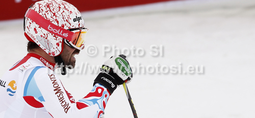 : Second placed Gauthier De Tessieres of France reacts in finish of men Super-g race of FIS Alpine skiing World Championships in Schladming, Austria. Men super-g race of FIS Alpine skiing World championships Schladming 2013, was held in Scladming, Austria, on Wednesday, 6th of February 2013.