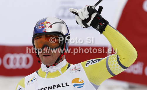 : Third placed Aksel Lund Svindal of Norway reacts in finish of men Super-g race of FIS Alpine skiing World Championships in Schladming, Austria. Men super-g race of FIS Alpine skiing World championships Schladming 2013, was held in Scladming, Austria, on Wednesday, 6th of February 2013.