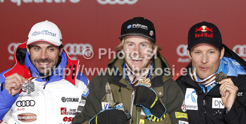 : Winner Ted Ligety of USA (M), second placed Gauthier De Tessieres of France (L) and third placed Aksel Lund Svindal of Norway (R) celebrate their medals won in men Super-g race of FIS Alpine skiing World Championships in Schladming, Austria. Men super-g race of FIS Alpine skiing World championships Schladming 2013, was held in Scladming, Austria, on Wednesday, 6th of February 2013.