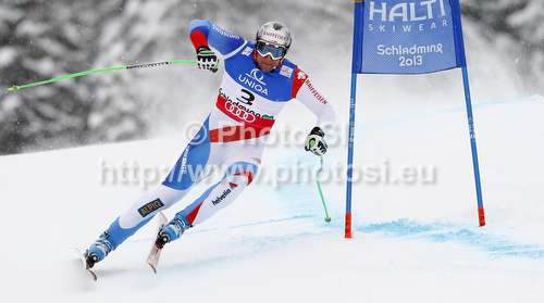 : Silvan Zurbriggen of Switzerland skiing in first training for men downhill race of FIS Alpine skiing World Championships in Schladming, Austria. First training for men downhill race of FIS Alpine skiing World championships Schladming 2013, was held in Schladming, Austria, on Thursday, 7th of February 2013.