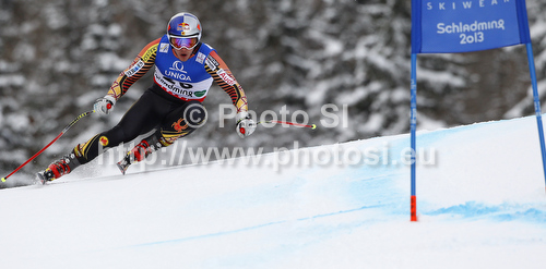 : Erik Guay of Canada skiing in first training for men downhill race of FIS Alpine skiing World Championships in Schladming, Austria. First training for men downhill race of FIS Alpine skiing World championships Schladming 2013, was held in Schladming, Austria, on Thursday, 7th of February 2013.