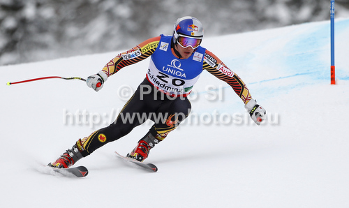: Erik Guay of Canada skiing in first training for men downhill race of FIS Alpine skiing World Championships in Schladming, Austria. First training for men downhill race of FIS Alpine skiing World championships Schladming 2013, was held in Schladming, Austria, on Thursday, 7th of February 2013.