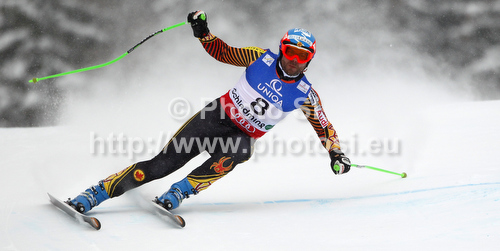 : Ninth placed Jan Hudec of Canada skiing in men downhill race of FIS Alpine skiing World Championships in Schladming, Austria. Men downhill race of FIS Alpine skiing World championships Schladming 2013, was held in Schladming, Austria, on Saturday, 9th of February 2013.