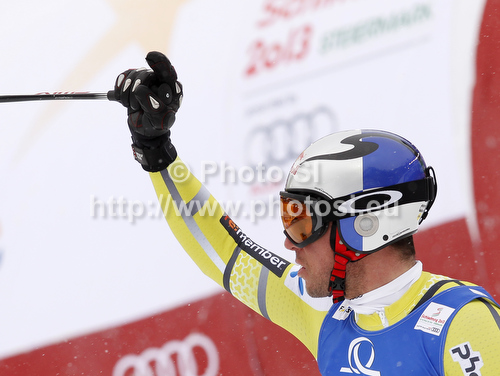 : Winner and new downhill World Champion Aksel Lund Svindal of Norway reacts in finish of men downhill race of FIS Alpine skiing World Championships in Schladming, Austria. Men downhill race of FIS Alpine skiing World championships Schladming 2013, was held in Schladming, Austria, on Saturday, 9th of February 2013.