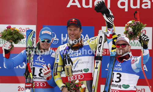 : Winner and new downhill World champion Aksel Lund Svindal of Norway (M), second placed Dominik Paris of Italy (L) and third placed David Poisson of France (R) celebrate their medals won in men downhill race of FIS Alpine skiing World Championships in Schladming, Austria. Men downhill race of FIS Alpine skiing World championships Schladming 2013, was held in Schladming, Austria, on Saturday, 9th of February 2013.