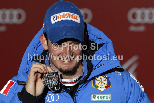 : Second placed Dominik Paris of Italy celebrates his medal won in men downhill race of FIS Alpine skiing World Championships in Schladming, Austria. Men downhill race of FIS Alpine skiing World championships Schladming 2013, was held in Schladming, Austria, on Saturday, 9th of February 2013.