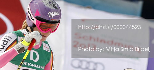 : Third placed Maria Hoefl-Riesch of Germany reacts in finish of women downhill race of FIS Alpine skiing World Championships in Schladming, Austria. Women downhill race of FIS Alpine skiing World championships Schladming 2013, was held in Schladming, Austria, on Sunday, 10th of February 2013.