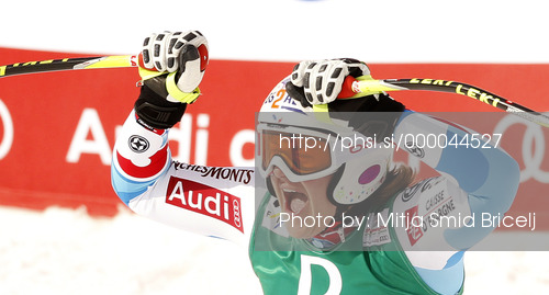: Winner and new women downhill World Champion Marion Rolland of France reacts in finish of women downhill race of FIS Alpine skiing World Championships in Schladming, Austria. Women downhill race of FIS Alpine skiing World championships Schladming 2013, was held in Schladming, Austria, on Sunday, 10th of February 2013.