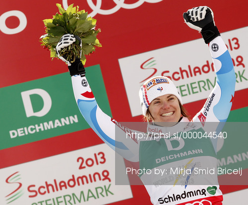 : Winner and new women downhill World Champion Marion Rolland of France celebrates her medal won in women downhill race of FIS Alpine skiing World Championships in Schladming, Austria. Women downhill race of FIS Alpine skiing World championships Schladming 2013, was held in Schladming, Austria, on Sunday, 10th of February 2013.