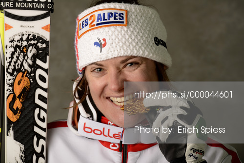 : Winner and new women downhill champion Marion Rolland of France celebrates her medal won in women downhill race of FIS Alpine skiing World Championships in Schladming, Austria. Women downhill race of FIS Alpine skiing World championships Schladming 2013, was held in Schladming, Austria, on Sunday, 10th of February 2013.