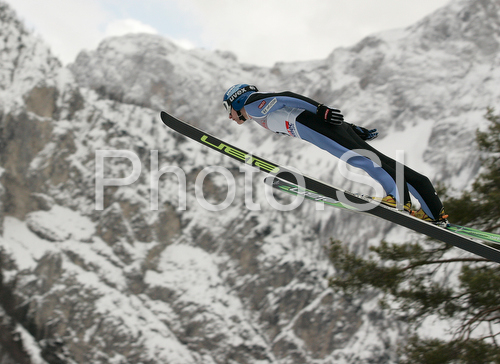 : Juha-Matti Ruuskanen of Finland soars through the air during qualification jump of FIS Ski jumping World Cup finals in Planica, Slovenia. Training and qualification sessions for FIS Ski jumping World cup were held in Planica, Slovenia, on K215 ski flying hill on 13th of March, 2008. FIS Ski jumping World cup finals were held in Planica, Slovenia between 13th and 16th of March 2008.