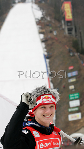 : Winner of overall Ski jumping World Cup, Thomas Morgenstern of Austria celebrates with his World Cup trophy after FIS Ski jumping World Cup finals in Planica, Slovenia. Training session for race of FIS Ski jumping World cup was held in Planica, Slovenia, on K215 ski flying hill on 16th of March, 2008. FIS Ski jumping World cup finals were held in Planica, Slovenia between 13th and 16th of March 2008.