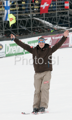: Finnish coach Tommi Nikunen skiing down to outrun of Planica ski flying hill after last race of FIS Ski jumping World Cup finals in Planica, Slovenia. Last race of FIS Ski jumping World cup were held in Planica, Slovenia, on K215 ski flying hill on 16th of March, 2008. FIS Ski jumping World cup finals were held in Planica, Slovenia between 13th and 16th of March 2008.