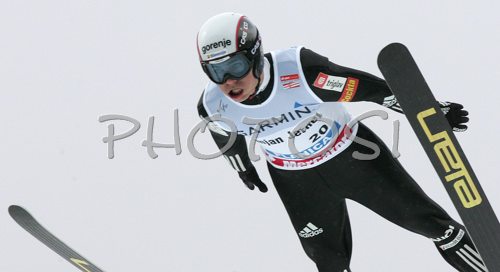 : Jernej Damjan of Slovenia soars through the air in second jump of last race of FIS Ski jumping World Cup finals in Planica, Slovenia. Last race of FIS Ski jumping World cup was held in Planica, Slovenia, on K215 ski flying hill on 16th of March, 2008. FIS Ski jumping World cup finals were held in Planica, Slovenia between 13th and 16th of March 2008.