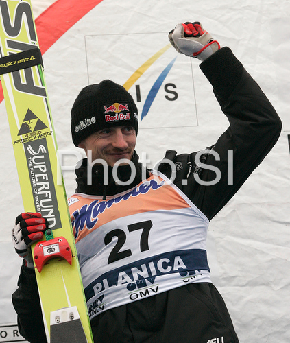 : Second placed Adam Malysz of Poland celebrates his medal won in day 1 of FIS Ski jumping World Cup finals in Planica, Slovenia. First day of FIS Ski jumping World cup finals was held on Friday, 20th of March 2009 in Planica, Slovenia.