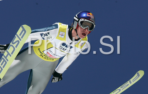 : Gregor Schlierenzauer of Austria soars through the air during first round of final race of FIS Ski jumping World Cup finals in Planica, Slovenia. Last race of FIS Ski jumping World cup 2008-09 was held on Sunday, 22nd of March 2009 in Planica, Slovenia.