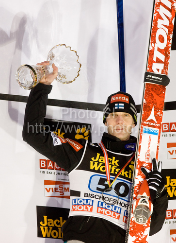 : Janne Ahonen of Finland celebrates winning second place at the 58th Four Hills ski jumping tournament at the medal ceremony, on January 6, 2010 in Bischofshofen, Austria.