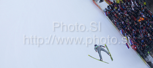 : Gregor Schlierenzauer of Austria soars through the air during first day of FIS Ski flying World championships in Planica, Slovenia. First day of FIS Ski flying World Championships was held on Friday, 19th of March 2010, in Planica, Slovenia.