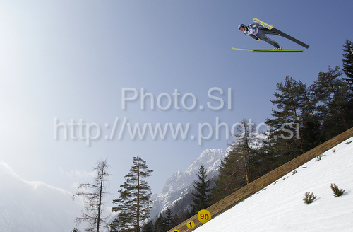 : Gregor Schlierenzauer of Austria soars through the air during his ski jump of second day of FIS Ski flying World championships in Planica, Slovenia. Second day of FIS Ski flying World Championships was held on Saturday, 20th of March 2010, in Planica, Slovenia.