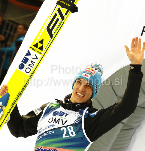 : Second placed Gregor Schlierenzauer of Austria celebrates his medal won in FIS Ski flying World championships in Planica, Slovenia. Second day of FIS Ski flying World Championships was held on Saturday, 20th of March 2010, in Planica, Slovenia.