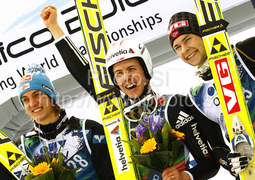: Winner Simon Ammann of Switzerland (M), second placed Gregor Schlierenzauer of Austria (L) and third placed Anders Jacobsen of Norway (R) celebrate their medals won in FIS Ski flying World championships in Planica, Slovenia. Second day of FIS Ski flying World Championships was held on Saturday, 20th of March 2010, in Planica, Slovenia.
