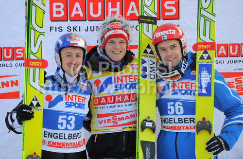 : Winner Thomas Morgenstern (AUT) (M), second placed Adam Malysz (POL) (L) and third placed Matti Hautamaeki (FIN) during FIS Ski jumping World cup race in Engelberg, Switzerland. FIS Ski jumping World cup in Engelberg, Switzerland was held on 18th of December 2010.