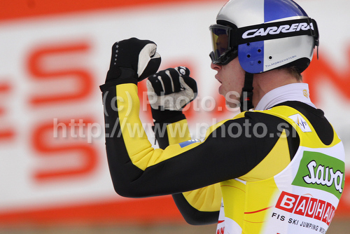 : Second placed Thomas Morgenstern of Austria reacts in outrun of final round of day 1 of FIS ski jumping World Cup 2010-2011 finals in Planica, Slovenia. Individual competition on first day of FIS ski jumping World cup finals was held on Friday, 18th of March 2011, in Planica, Slovenia.